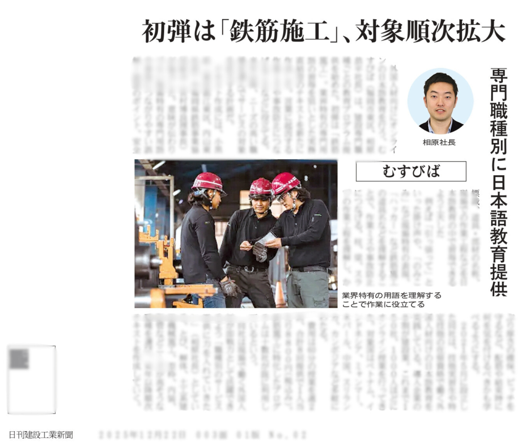 【メディア掲載】日刊建設工業新聞にインタビューが掲載されました 2025.12.22 お知らせ 2025年12月22日の日刊建設工業新聞にむすびばの鉄筋施工向け日本語教育サービスが掲載されました。 ホーム 記事一覧 お知らせ 【メディア掲載】日刊建設工業新聞にインタビューが掲載されました 資料ダウンロード プログラムの特長や、カリキュラムの内容が記載されたパンフレットを無料でダウンロードいただけます。 建設業向けオンライン日本語教室介護士向けオンライン日本語教室全職種向けオンライン日本語教室入国後講習 会社名(必須) お名前(必須) 電話番号(必須) メールアドレス(必須) プライバシーポリシーに同意する むすびばのプライバシーポリシーに同意する